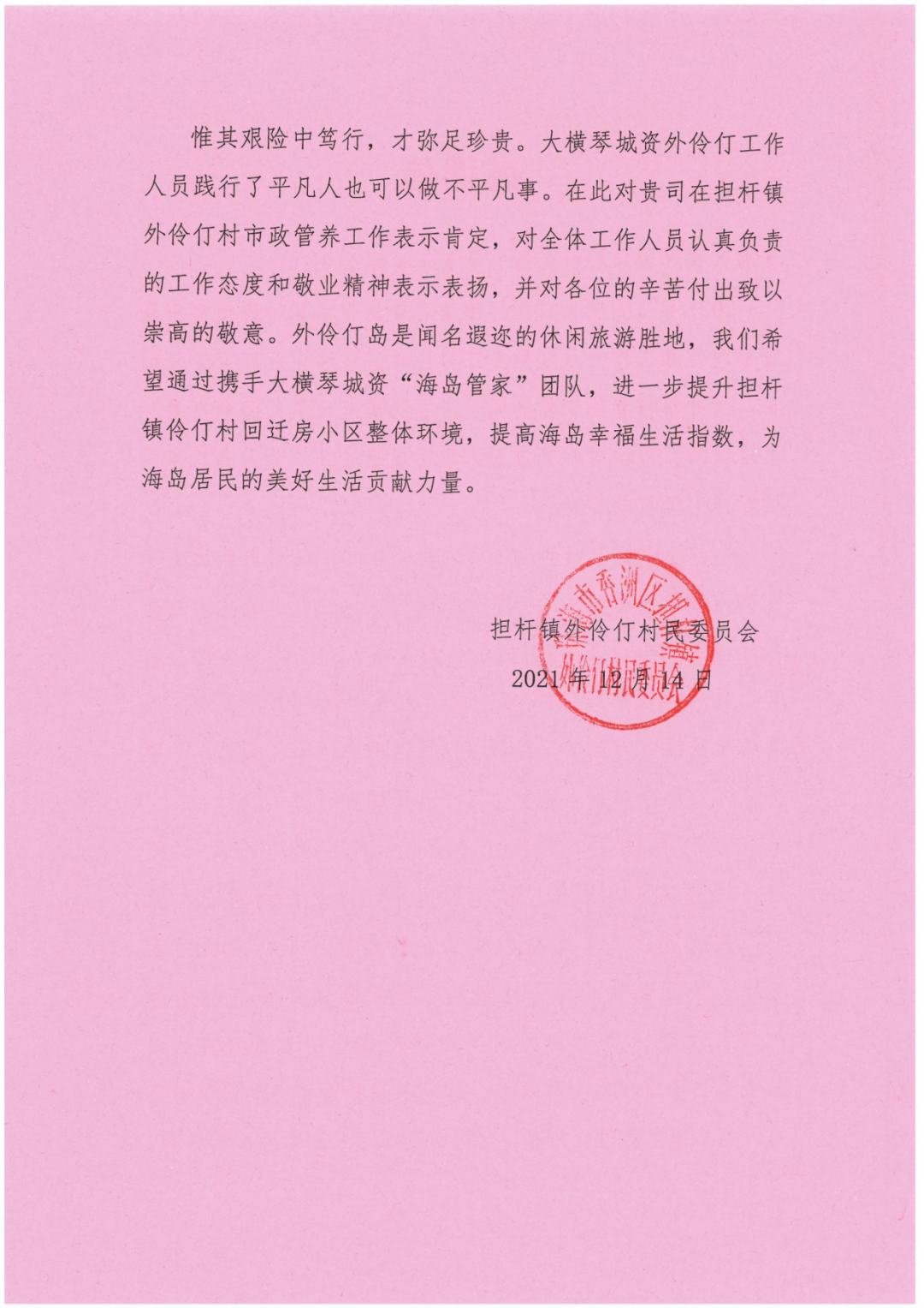 作為珠海最早探索“海島管家”特色服務(wù)的專業(yè)公司之一,大橫琴城資海島服務(wù)團(tuán)隊于2021年率先進(jìn)駐擔(dān)桿鎮(zhèn),并逐步將服務(wù)版圖擴(kuò)展至桂山島,在鎮(zhèn)政府的統(tǒng)一領(lǐng)導(dǎo)下,為助力美麗海島高質(zhì)量發(fā)展保駕護(hù)航。此次再度進(jìn)駐外伶仃島,既承載了客戶和居民的信任與期盼,也展現(xiàn)了大橫琴城資持續(xù)深耕海島服務(wù)的決心與信心。