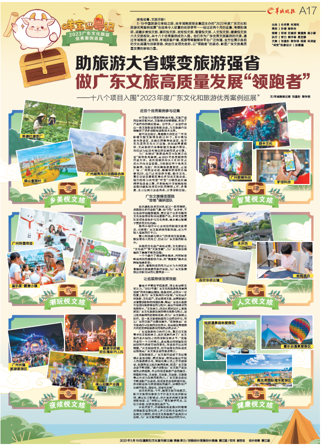 “2023年度廣東文化和旅游優(yōu)秀案例巡展”由羊城晚報報業(yè)集團(tuán)主辦,旨在為廣東建成“旅游業(yè)高質(zhì)量發(fā)展示范省”探尋優(yōu)秀案例。此次巡展活動從3月20日正式公開向全省征集,共收到近百個優(yōu)秀文旅案例,包括廣州長隆旅游度假區(qū)、正佳廣場、廣州熱雪奇跡、順德華僑城歡樂海岸PLUS、江門赤坎華僑古鎮(zhèn)、勵豐文化、熹樂谷溫泉度假區(qū)等眾多知名文旅企業(yè)、項目。最終,經(jīng)過近兩個月的征集、考察和調(diào)研,包括橫琴星樂度·露營小鎮(zhèn)在內(nèi)的18個項目正式入圍。