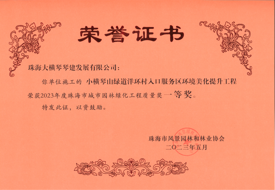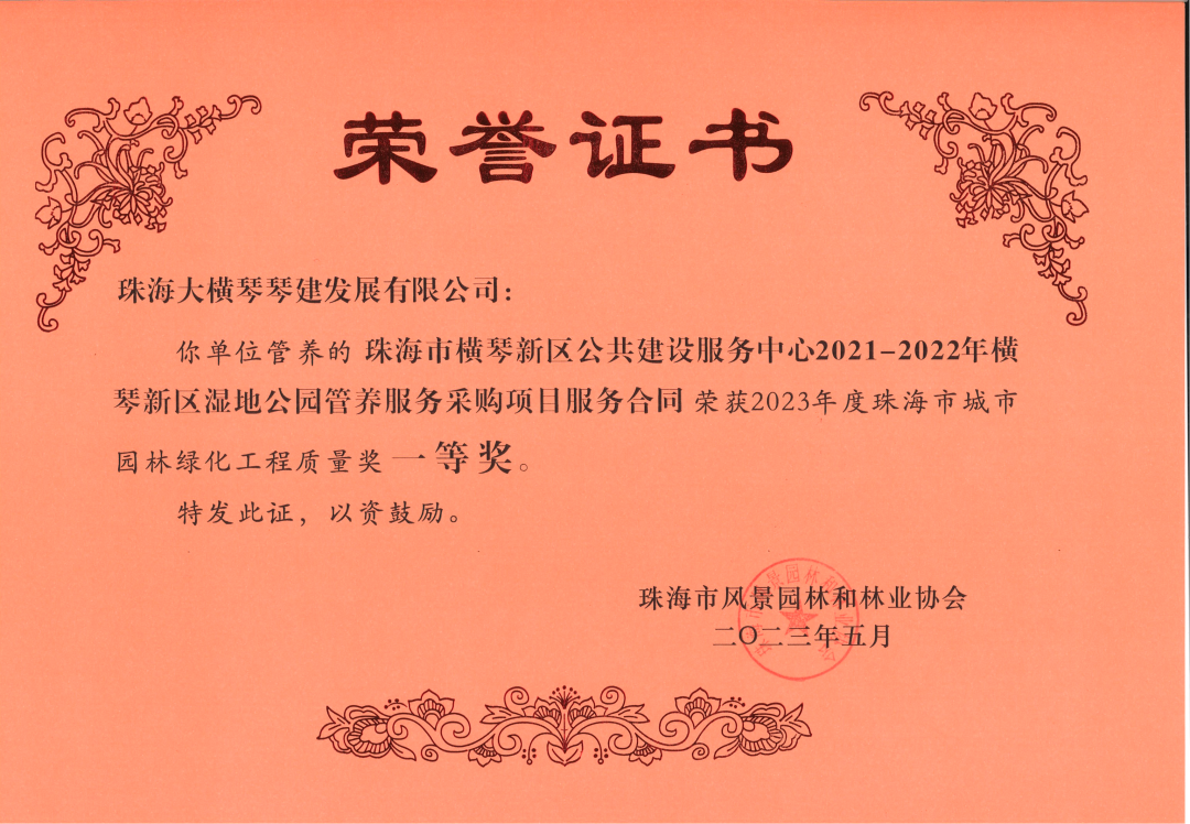 近日,珠海大橫琴琴建發(fā)展有限公司、珠海市橫琴新區(qū)公共建設(shè)服務(wù)中心,2021-2022年橫琴新區(qū)濕地公園管養(yǎng)服務(wù)采購項目服務(wù)合同,小橫琴山綠道洋環(huán)村入口服務(wù)區(qū),環(huán)境美化提升工程,以及作為代建單位負(fù)責(zé)建設(shè)的古樹名木公園(粗沙環(huán))項目,榮獲由珠海市風(fēng)景園林和林業(yè)協(xié)會頒發(fā)的2023年度珠海市城市園林綠化工程質(zhì)量獎一等獎。