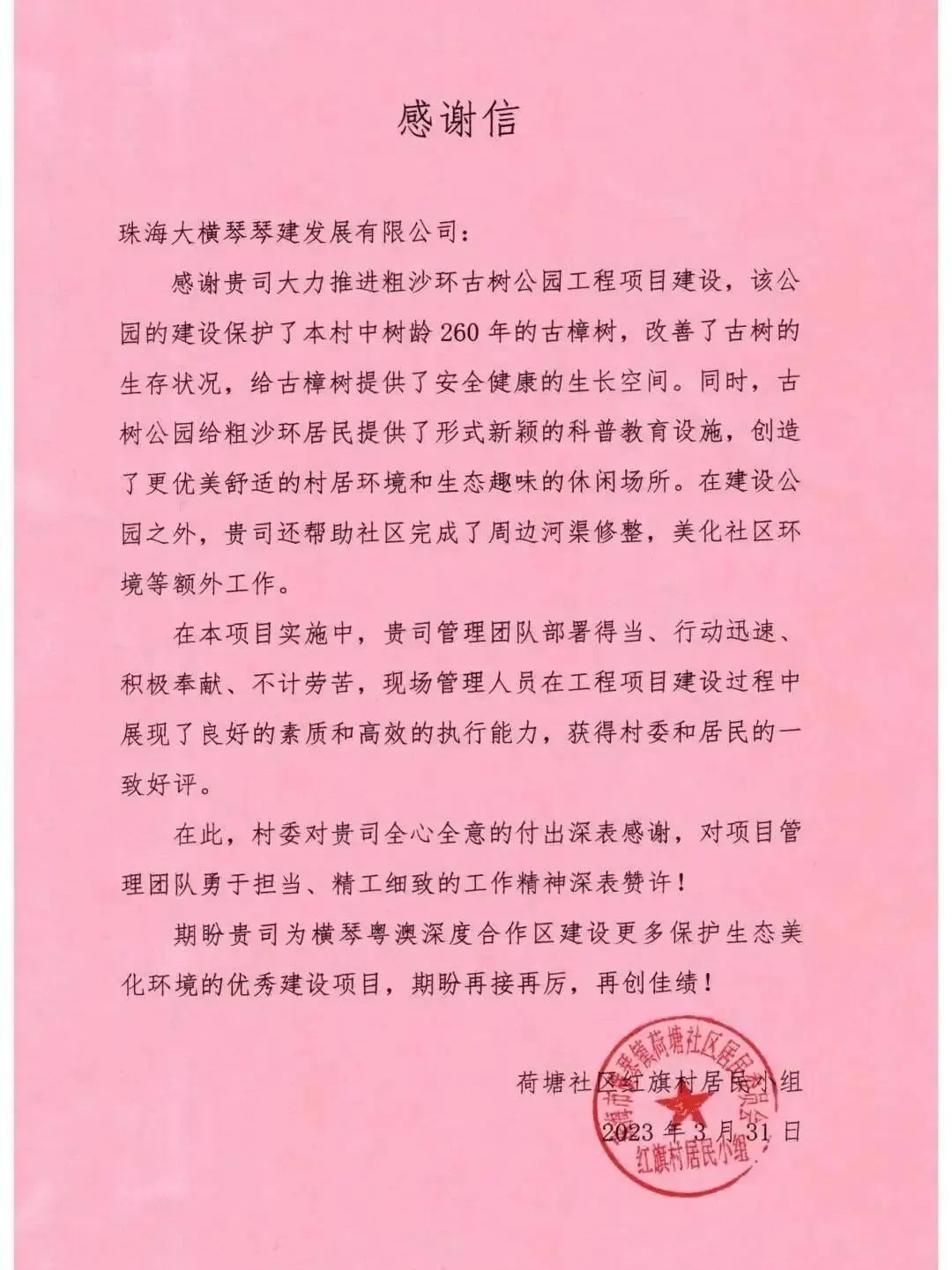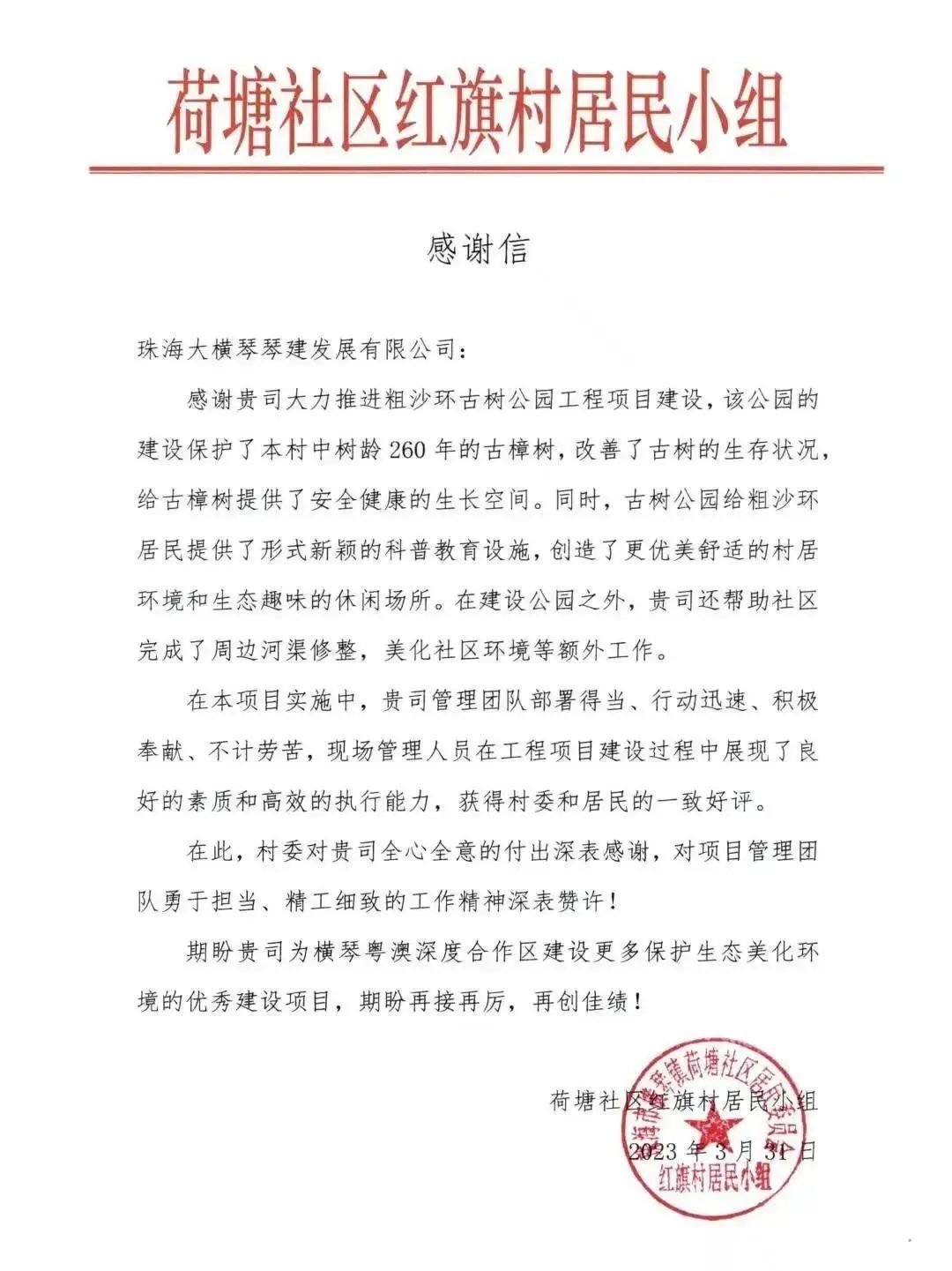 古樹公園的建成改善了周邊村居環(huán)境,也得到了附近村民的喜愛。荷塘社區(qū)紅旗村居民小組還給琴建公司發(fā)來了感謝信。