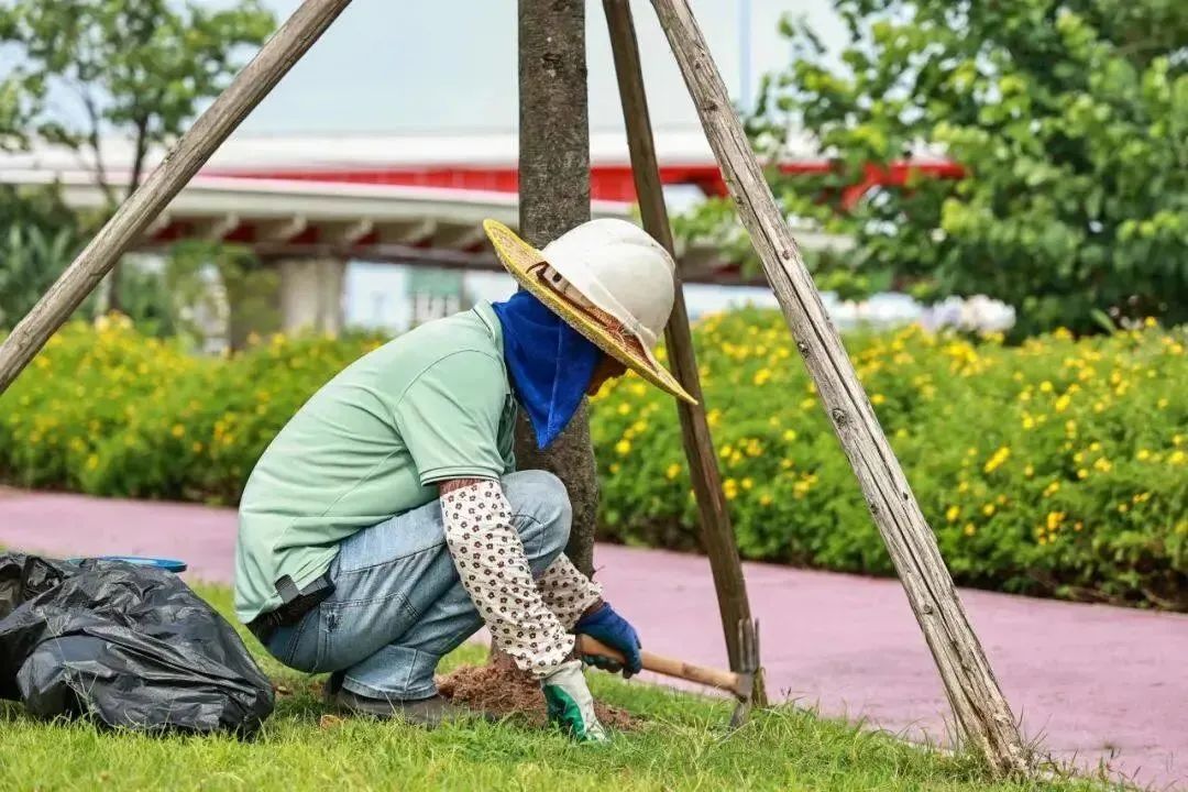 今年三月,琴建公司就對花海長廊三大開花喬木景觀區(qū)開始了樹盤梳理、打孔施肥、噴淋系統(tǒng)修復(fù)等工作,在樹木管養(yǎng)上做到未雨綢繆,在病蟲害防治等日常養(yǎng)護工作之外,提前檢查樹枝生長情況、及時修剪清理枯枝,防止枯枝掉落砸傷游人,有效預(yù)防并減少臺風傷害。