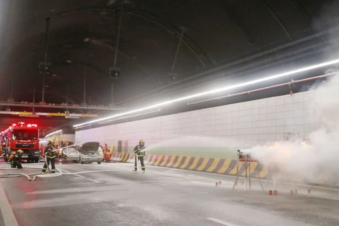 守護(hù)安全,分秒必爭(zhēng)。隧道運(yùn)行環(huán)境錯(cuò)綜復(fù)雜,推動(dòng)“人治”向“智治”轉(zhuǎn)變尤為重要。本次演練增設(shè)了消防噴淋系統(tǒng)演練環(huán)節(jié),真實(shí)呈現(xiàn)系統(tǒng)自動(dòng)滅火過(guò)程。隧道火焰探測(cè)器感應(yīng)到火災(zāi)后自主發(fā)出告警信息,啟動(dòng)噴淋系統(tǒng)滅火,做到安全、迅速、及時(shí)。
